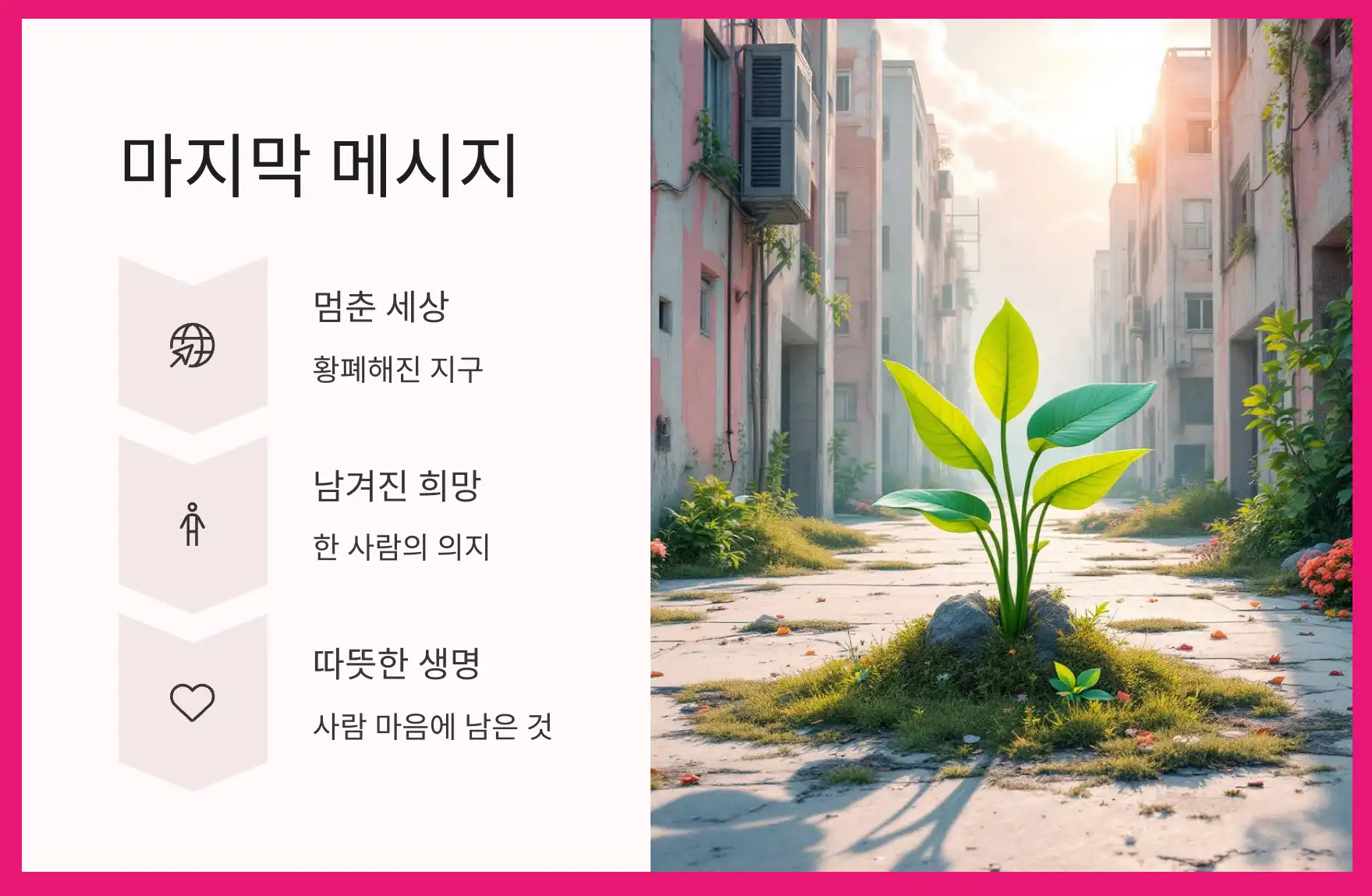 세상이 멈춘 그곳에서, 한 사람이 남긴 희망은 아주 조용히 피어났습니다. 지구가 사라질지라도, 사람의 마음엔 여전히 따뜻한 생명이 남아 있다는 것을 이 영화는 말해주고 있습니다.