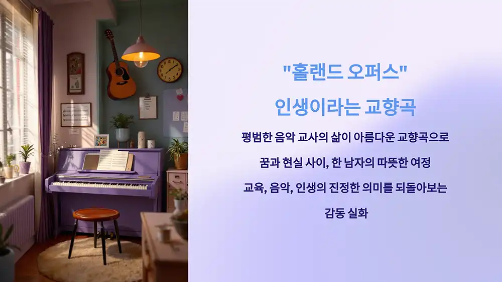 1995년 개봉한 영화 〈홀랜드 오퍼스〉는 꿈과 현실 사이에서 흔들리는 한 남자의 삶을 따뜻하게 그려냅니다. 교육, 음악, 그리고 인생의 진짜 의미를 되돌아보게 하는 이 감동 실화는 지금 다시 꺼내보기 딱 좋은 명작입니다.