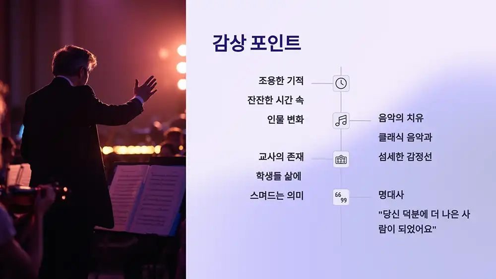 학생 한 명, 한 명의 삶에 의미 있게 스며드는 교사의 모습. 이 영화는 교육의 본질이 무엇인지, 진정한 가르침이란 어떤 것인지에 대해 조용히 질문을 던집니다.