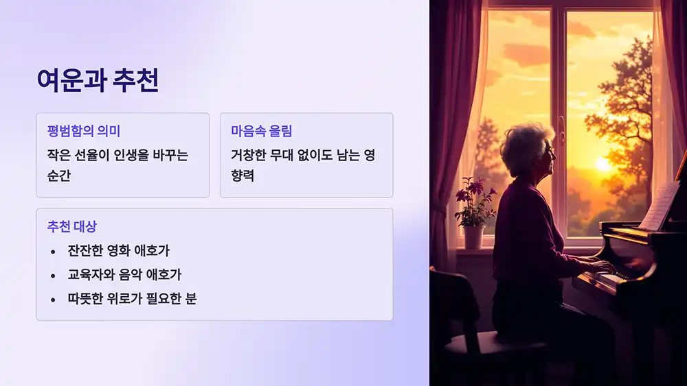 가끔은 내 삶이 너무 평범해서 아무 의미도 없는 것처럼 느껴질 때가 있어요. 하지만 〈홀랜드 오퍼스〉를 보고 나면, 그 평범함 속에도 누군가의 인생을 바꾸는 작은 선율이 숨어 있다는 걸 깨닫게 됩니다.