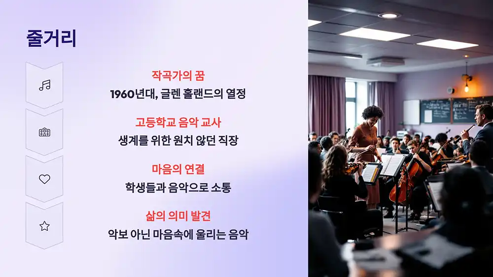 1960년대, 작곡가의 꿈을 품은 한 남자, 글렌 홀랜드는 생계를 위해 고등학교 음악 교사로 일하게 됩니다. 원치 않던 직장이었지만, 그는 학생들과 음악을 통해 조금씩 마음을 나누고, 그 과정에서 자신조차 몰랐던 삶의 가치와 의미를 발견하게 되죠. 시간이 흐르고, 그의 음악은 악보가 아닌 사람들의 마음 속에서 깊은 메아리가 되어 연주되기 시작합니다.